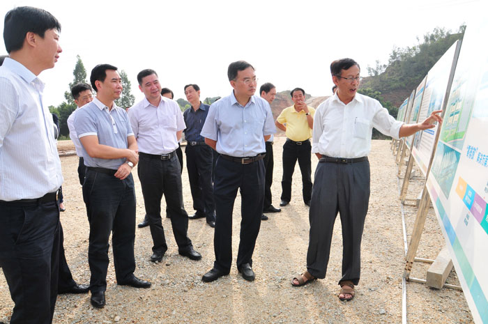 揭陽市常務副市長陳澄民向潮州副市長盧淳杰一行介紹生態城首期工程建設情況